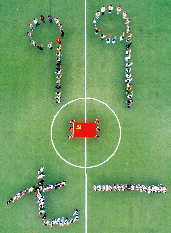 2020年6月30日,江蘇省泰州市大馮中心小學(xué)開(kāi)展“童心向黨迎七一”主題班會(huì),通過(guò)給學(xué)生上黨課、講黨史等方式,讓學(xué)生了解黨的光輝歷程,迎接中國(guó)共產(chǎn)黨建黨99周年。圖為活動(dòng)中擺出的“七一”、“99”和黨旗的組合圖案。中新社發(fā)湯德宏/攝