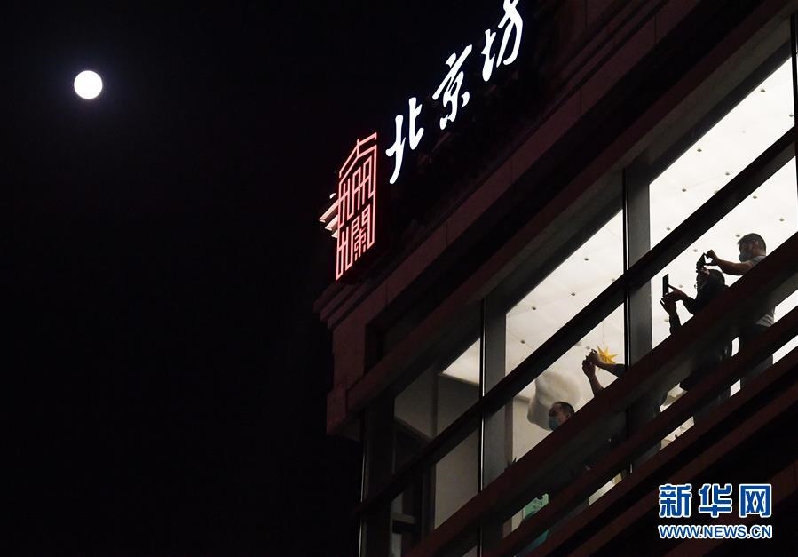 10月1日,幾位游客駐足在北京坊的建筑內(nèi)拍攝夜景。當(dāng)日是農(nóng)歷八月十五,傳統(tǒng)的中秋節(jié)與國慶節(jié)相遇,共迎圓月。新華社記者李賀攝