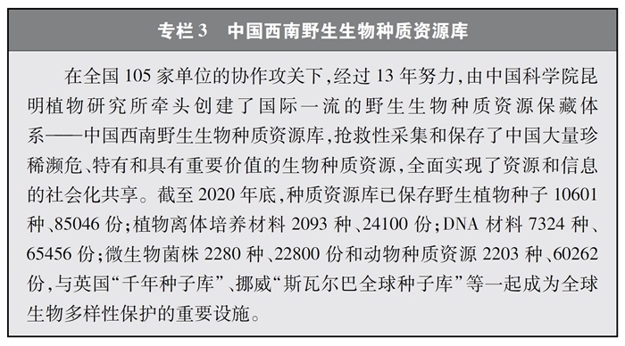 加快重要生物遺傳資源收集保存和利用。中國高度重視生物資源保護,近年來在生物資源調(diào)查、收集、保存等方面取得較大進展。實施戰(zhàn)略生物資源計劃專項,完善生物資源收集收藏平臺,建立種質(zhì)資源創(chuàng)新平臺、遺傳資源衍生庫和天然化合物轉(zhuǎn)化平臺,持續(xù)加強野生生物資源保護和利用。實施一批種質(zhì)資源保護和育種創(chuàng)新項目,截至2020年底,形成了以國家作物種質(zhì)長期庫及其復份庫為核心、10座中期庫與43個種質(zhì)圃為支撐的國家作物種質(zhì)資源保護體系,建立了199個國家級畜禽遺傳資源保種場(區(qū)、庫),為90%以上的國家級畜禽遺傳資源保護名錄品種建立了國家級保種單位,長期保存作物種質(zhì)資源52萬余份、畜禽遺傳資源96萬份。建設(shè)99個國家級林木種質(zhì)資源保存庫,以及新疆、山東2個國家級林草種質(zhì)資源設(shè)施保存庫國家分庫,保存林木種質(zhì)資源4.7萬份。建設(shè)31個藥用植物種質(zhì)資源保存圃和2個種質(zhì)資源庫,保存種子種苗1.2萬多份。