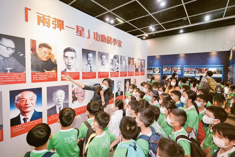 2021年6月27日至7月9日,“時代精神耀香江”之百年中國科學(xué)家主題展在香港向公眾開放。圖為7月7日,眾多小學(xué)生仔細聆聽講解員的介紹。中新社記者張煒/攝
