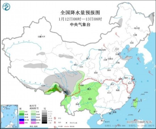 全國(guó)降水量預(yù)報(bào)圖(1月12日8時(shí)-13日8時(shí))