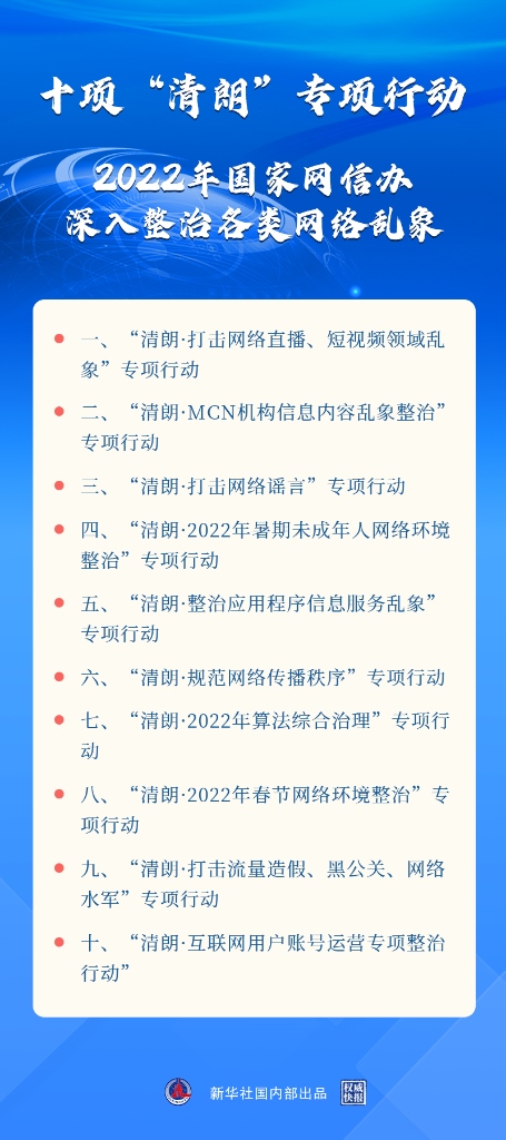 新華社北京3月17日電(記者王思北)記者17日從國新辦舉行的新聞發(fā)布會獲悉,2022年“清朗”系列專項(xiàng)行動將重點(diǎn)開展打擊網(wǎng)絡(luò)謠言,打擊網(wǎng)絡(luò)直播、短視頻領(lǐng)域亂象,算法綜合治理,暑期未成年人網(wǎng)絡(luò)環(huán)境整治等十方面任務(wù)。