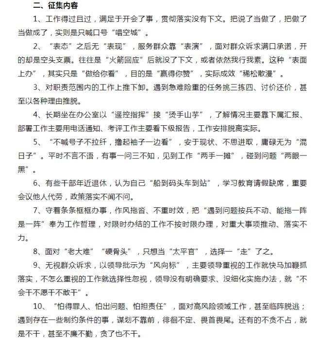 “躺平式干部”線索的征集包括10個方面,例如,“工作得過且過,滿足于開會了事”,“‘表態(tài)’之后無‘表現(xiàn)’,服務群眾靠‘表演’”,“平時不言不語,有事一問三不知”,等等。