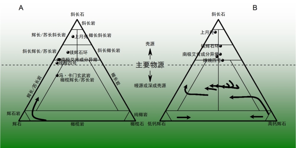 以往對(duì)南極-艾肯盆地物質(zhì)成分的研究大多只注重鎂鐵質(zhì)礦物,由于這一地區(qū)的鎂鐵質(zhì)異常特征,甚至引發(fā)了有關(guān)月幔是橄欖巖還是輝石巖的爭(zhēng)論。雖然根據(jù)月球巖漿洋假說(shuō),橄欖石和輝石是月幔的主要礦物,但是月殼形成之后的深成巖漿侵入作用同樣能夠在月殼中形成富集橄欖石或輝石的巖石,因此富集橄欖石或輝石并不能作為源自月幔的證據(jù)。迄今人類還沒(méi)有獲取南極-艾肯盆地的樣品返回地球,無(wú)法獲知其微量元素和同位素特征,通過(guò)遙感或原位探測(cè)可獲得的物質(zhì)成分信息中,斜長(zhǎng)石含量也是區(qū)分殼源和幔源巖石的關(guān)鍵指標(biāo)。