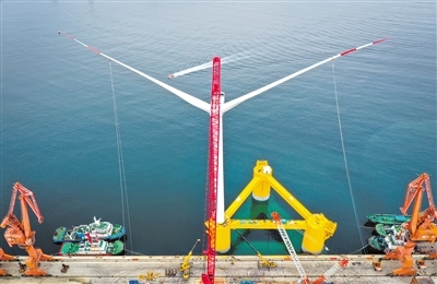 由中國船舶集團(tuán)海裝風(fēng)電股份有限公司牽頭,聯(lián)合相關(guān)單位自主研制的“扶搖號”浮式風(fēng)電機(jī)組浮體平臺上配備6.2兆瓦抗臺型I類風(fēng)力發(fā)電機(jī)組,在深遠(yuǎn)海應(yīng)用場將依靠九個對稱分布的懸錨鏈系泊實現(xiàn)固定。圖為完成總裝的國內(nèi)首臺深遠(yuǎn)海浮式風(fēng)電裝備“扶搖號”在茂名廣港碼頭靜待拖航(無人機(jī)照片)。記者劉大偉攝