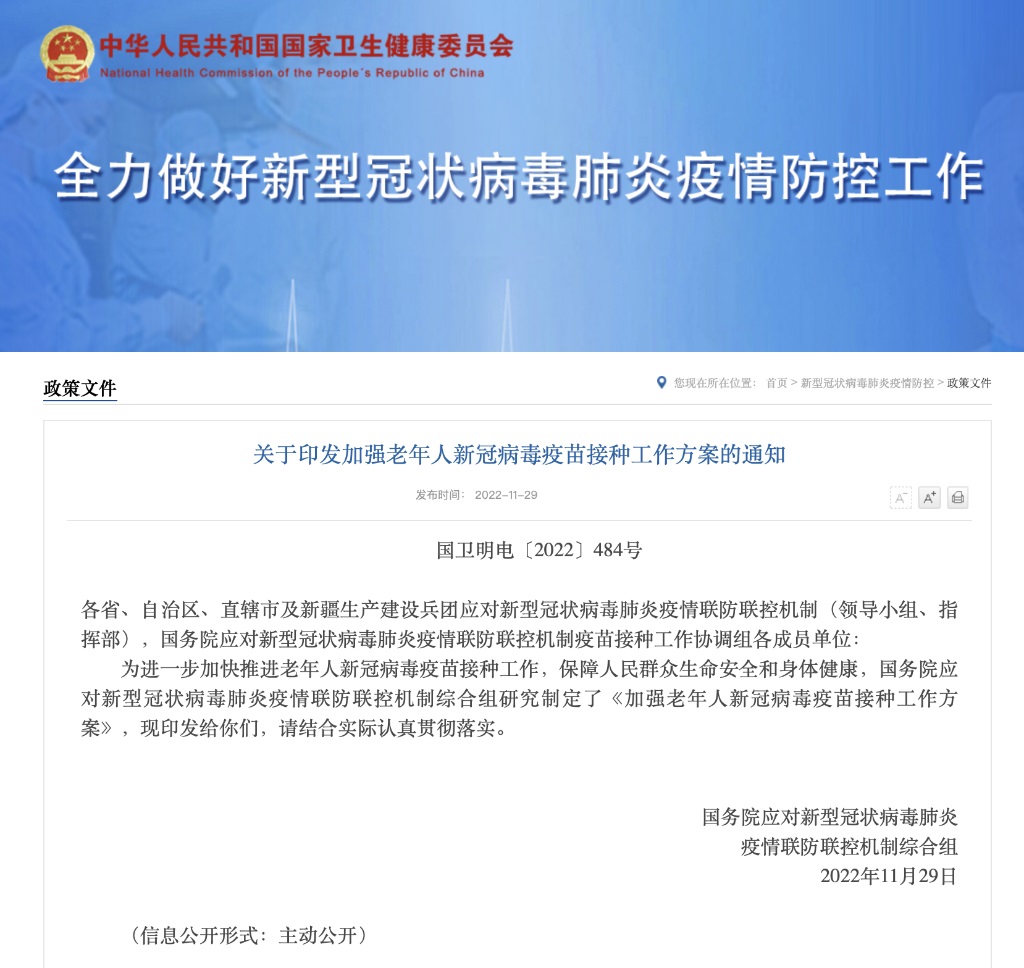 國(guó)務(wù)院聯(lián)防聯(lián)控機(jī)制印發(fā)《加強(qiáng)老年人新冠病毒疫苗接種工作方案》