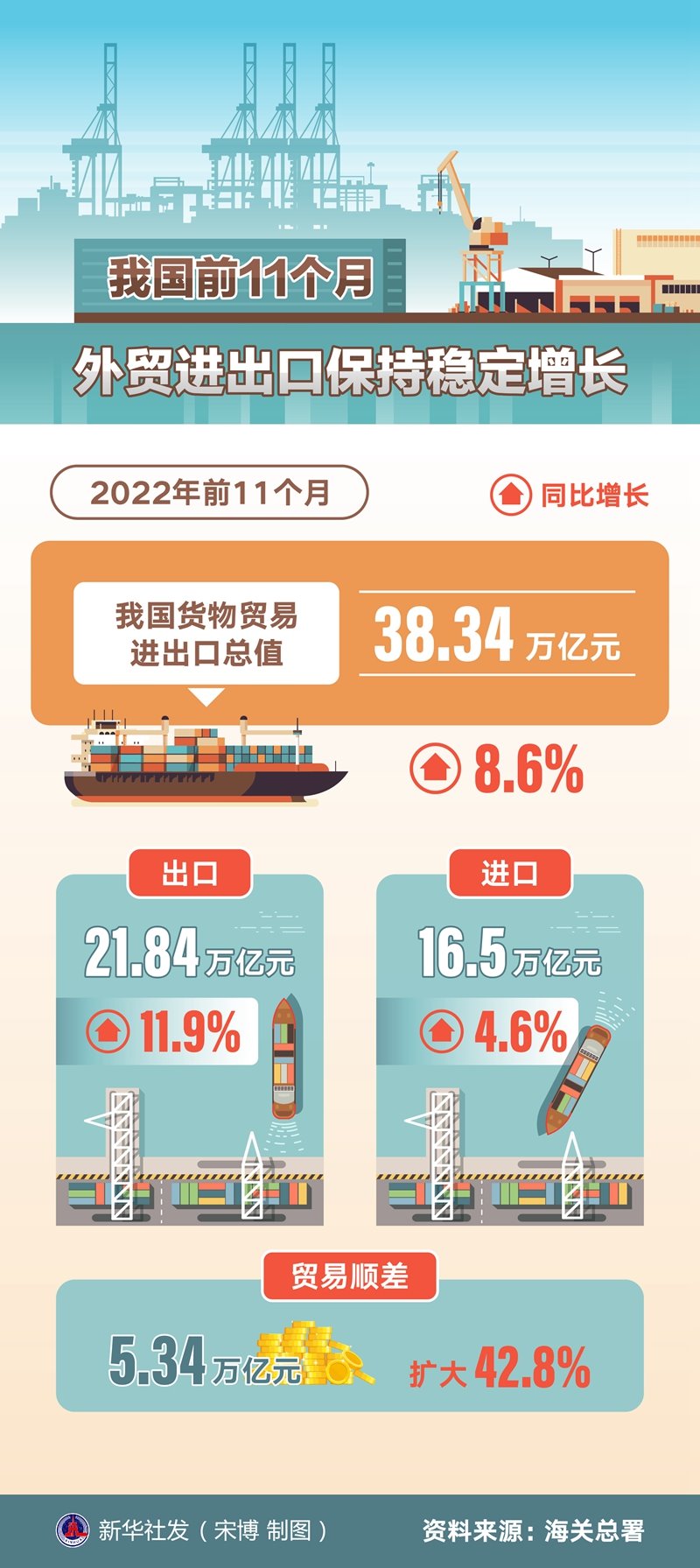 新華社北京12月7日電(記者鄒多為)海關(guān)總署7日發(fā)布數(shù)據(jù):今年前11個月,我國貨物貿(mào)易進(jìn)出口總值38.34萬億元,同比增長8.6%。其中,出口21.84萬億元,增長11.9%;進(jìn)口16.5萬億元,增長4.6%;貿(mào)易順差5.34萬億元,擴(kuò)大42.8%。