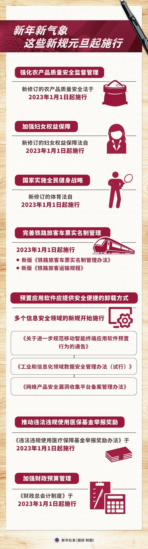 當2023年的鐘聲敲響,一批元旦起施行的新規(guī),將為我們帶來新年新氣象。新修訂的農(nóng)產(chǎn)品質(zhì)量安全法全鏈條保障“舌尖上的安全”;新修訂的婦女權(quán)益保障法進一步促進男女平等;新修訂的體育法構(gòu)建全民健身公共服務體系……法治的溫度,彰顯社會的進步。