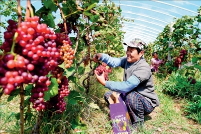 在山東省惠民縣胡集鎮(zhèn)惠臺(tái)葡萄專業(yè)合作社,村民在采摘葡萄(2022 年 9 月 24 日攝) 郭緒雷攝 / 本刊