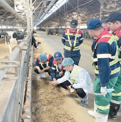 全國人大代表、內(nèi)蒙古蒙牛乳業(yè)(集團(tuán))股份有限公司研發(fā)創(chuàng)新部研發(fā)總監(jiān)史玉東(前排左三)在當(dāng)?shù)啬膛pB(yǎng)殖場調(diào)研。全國人大常委會(huì)辦公廳聯(lián)絡(luò)局供圖