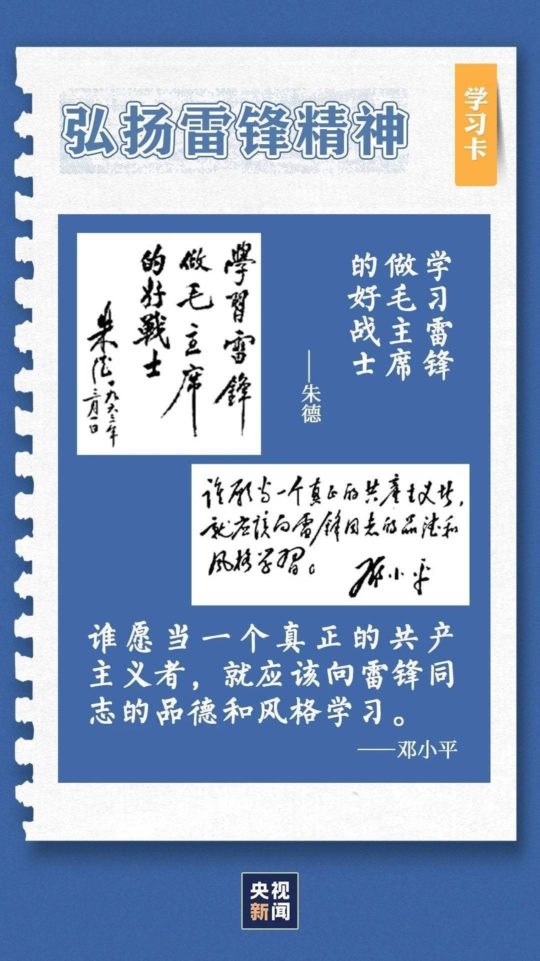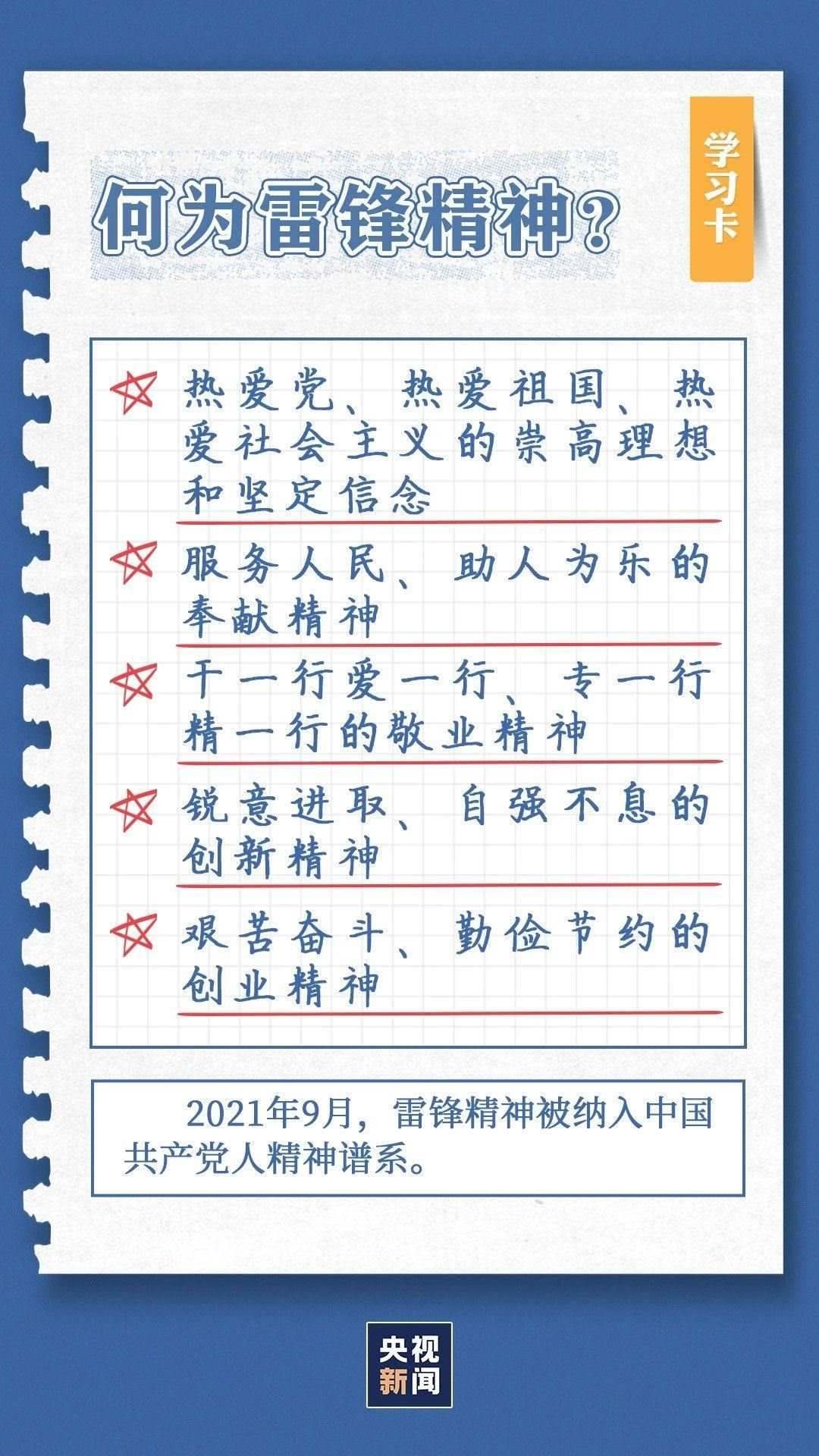 中共中央總書記、國家主席、中央軍委主席習(xí)近平近日作出重要指示指出,今年是毛澤東等老一輩革命家為雷鋒同志題詞60周年。60年來,學(xué)雷鋒活動(dòng)在全國持續(xù)深入開展,雷鋒的名字家喻戶曉,雷鋒的事跡深入人心,雷鋒精神滋養(yǎng)著一代代中華兒女的心靈。實(shí)踐證明,無論時(shí)代如何變遷,雷鋒精神永不過時(shí)。在新時(shí)代新征程上,如何弘揚(yáng)雷鋒精神?點(diǎn)擊學(xué)習(xí)卡↓
