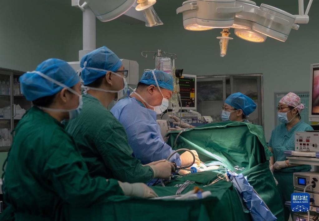 在北京市第六醫(yī)院的醫(yī)聯(lián)體胸外科病房手術(shù)室,北京協(xié)和醫(yī)院與北京市第六醫(yī)院的醫(yī)護(hù)人員進(jìn)行團(tuán)隊協(xié)作開展胸腔鏡手術(shù)(2021年6月3日攝)。新華社記者 才揚(yáng) 攝