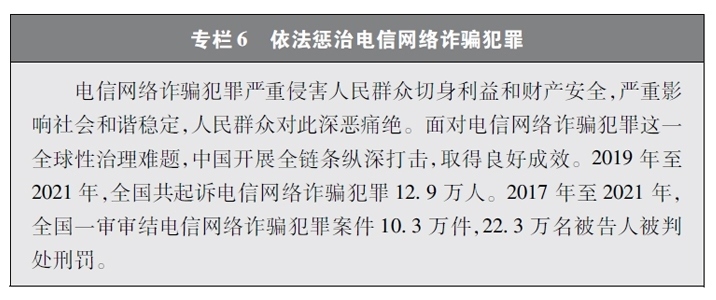 加大網(wǎng)絡(luò)犯罪懲治力度。隨著互聯(lián)網(wǎng)技術(shù)的快速發(fā)展,傳統(tǒng)犯罪加速向以互聯(lián)網(wǎng)為媒介的非接觸式犯罪轉(zhuǎn)變,電信網(wǎng)絡(luò)詐騙、網(wǎng)絡(luò)賭博、網(wǎng)絡(luò)淫穢色情等涉網(wǎng)違法犯罪多發(fā)。中國依法辦理新型網(wǎng)絡(luò)犯罪案件。連續(xù)多年開展“凈網(wǎng)行動”,嚴(yán)厲打擊群眾反映強(qiáng)烈的黑客攻擊破壞、侵犯公民個(gè)人信息等違法犯罪活動。持續(xù)推進(jìn)“云劍”“斷卡”“斷流”“拔釘”等專項(xiàng)行動,打擊套路貸、校園貸、“以房養(yǎng)老”、“投資養(yǎng)老”等電信網(wǎng)絡(luò)詐騙犯罪,依法懲處為電信網(wǎng)絡(luò)詐騙犯罪團(tuán)伙提供互聯(lián)網(wǎng)接入、域名注冊、服務(wù)器托管、移動互聯(lián)網(wǎng)應(yīng)用程序制作開發(fā)、網(wǎng)絡(luò)支付、引流推廣等服務(wù)支撐的黑灰產(chǎn)業(yè)。完善國家反詐大數(shù)據(jù)平臺和反詐移動互聯(lián)網(wǎng)應(yīng)用程序,建設(shè)國家涉詐黑樣本庫,完善快速止付凍結(jié)機(jī)制、涉詐資金返還機(jī)制。堅(jiān)決打擊網(wǎng)絡(luò)賭博犯罪行為,從嚴(yán)治理網(wǎng)絡(luò)淫穢色情。網(wǎng)絡(luò)犯罪治理工作取得明顯成效,人民群眾安全感有效提升,社會更加和諧穩(wěn)定。