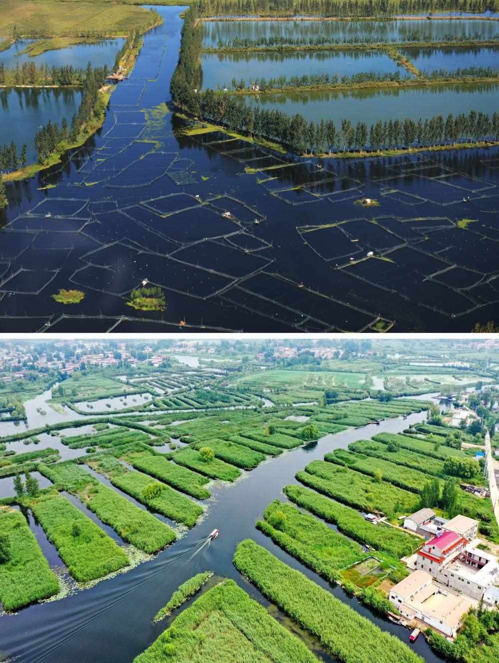 拼版照片:上圖為2012年9月29日拍攝的白洋淀(金潔 攝);下圖為2021年8月14日拍攝的白洋淀風(fēng)光(無(wú)人機(jī)照片,新華社記者牟宇攝)。