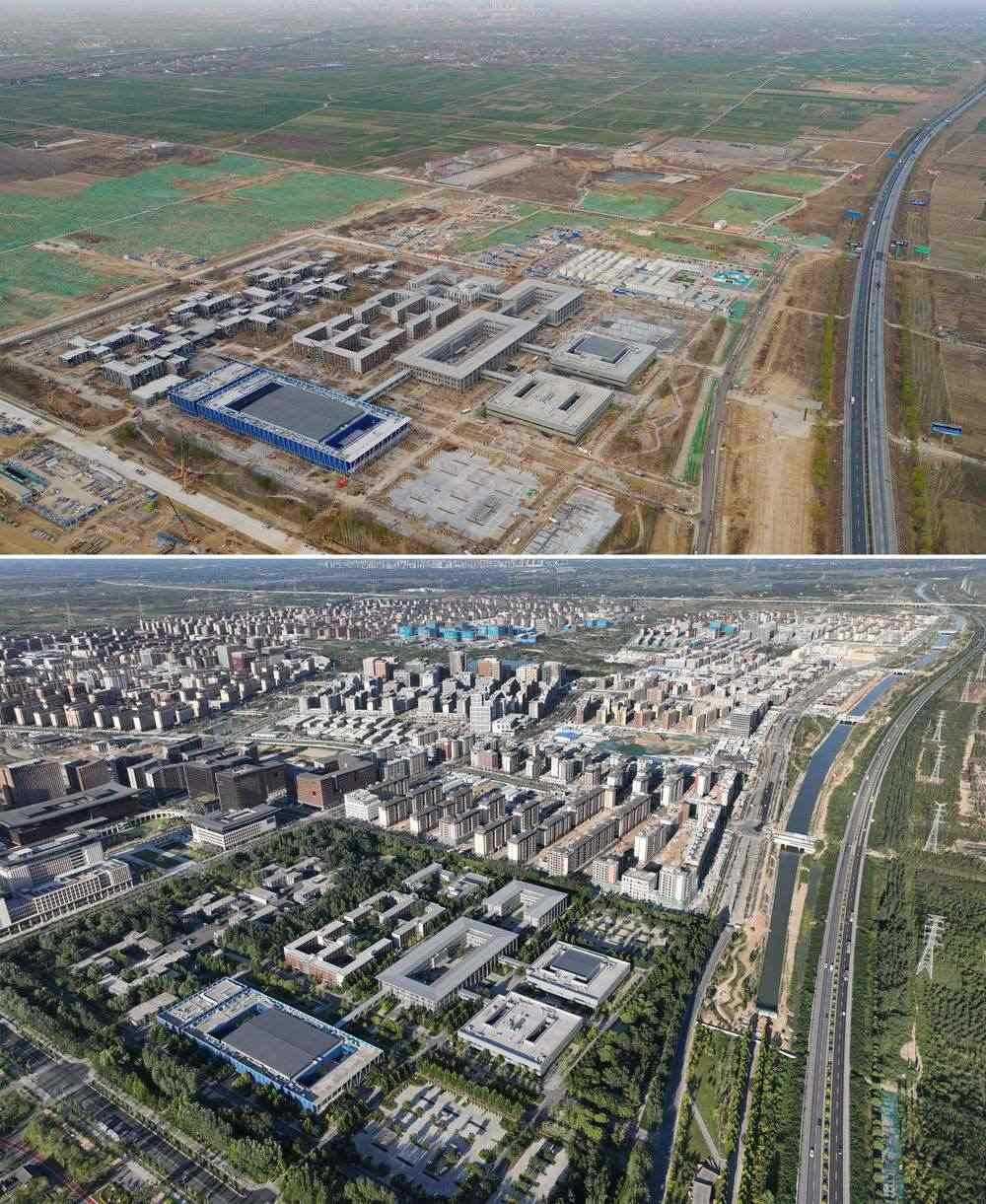 拼版照片:上圖為2018年3月29日拍攝的雄安市民服務(wù)中心(無(wú)人機(jī)照片);下圖為2022年9月6日拍攝的雄安市民服務(wù)中心(無(wú)人機(jī)照片)。