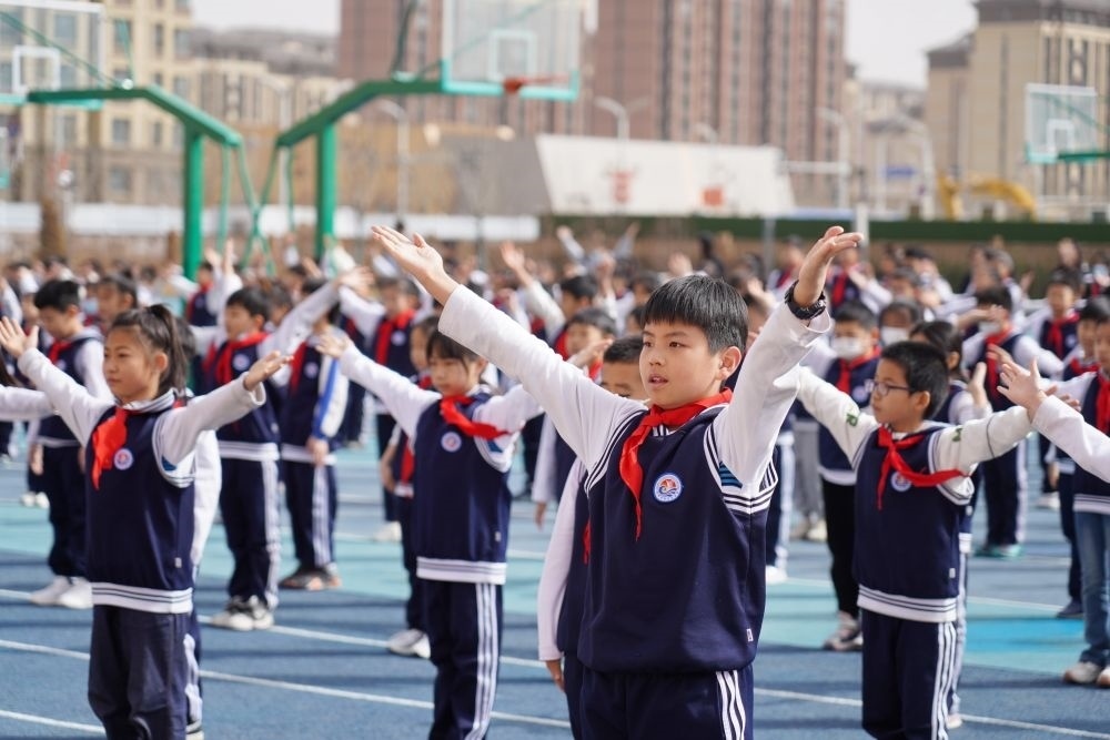 雄安新區(qū)容西片區(qū)云溪小學(xué)的學(xué)生在操場(chǎng)上做操(3月23日攝)。
