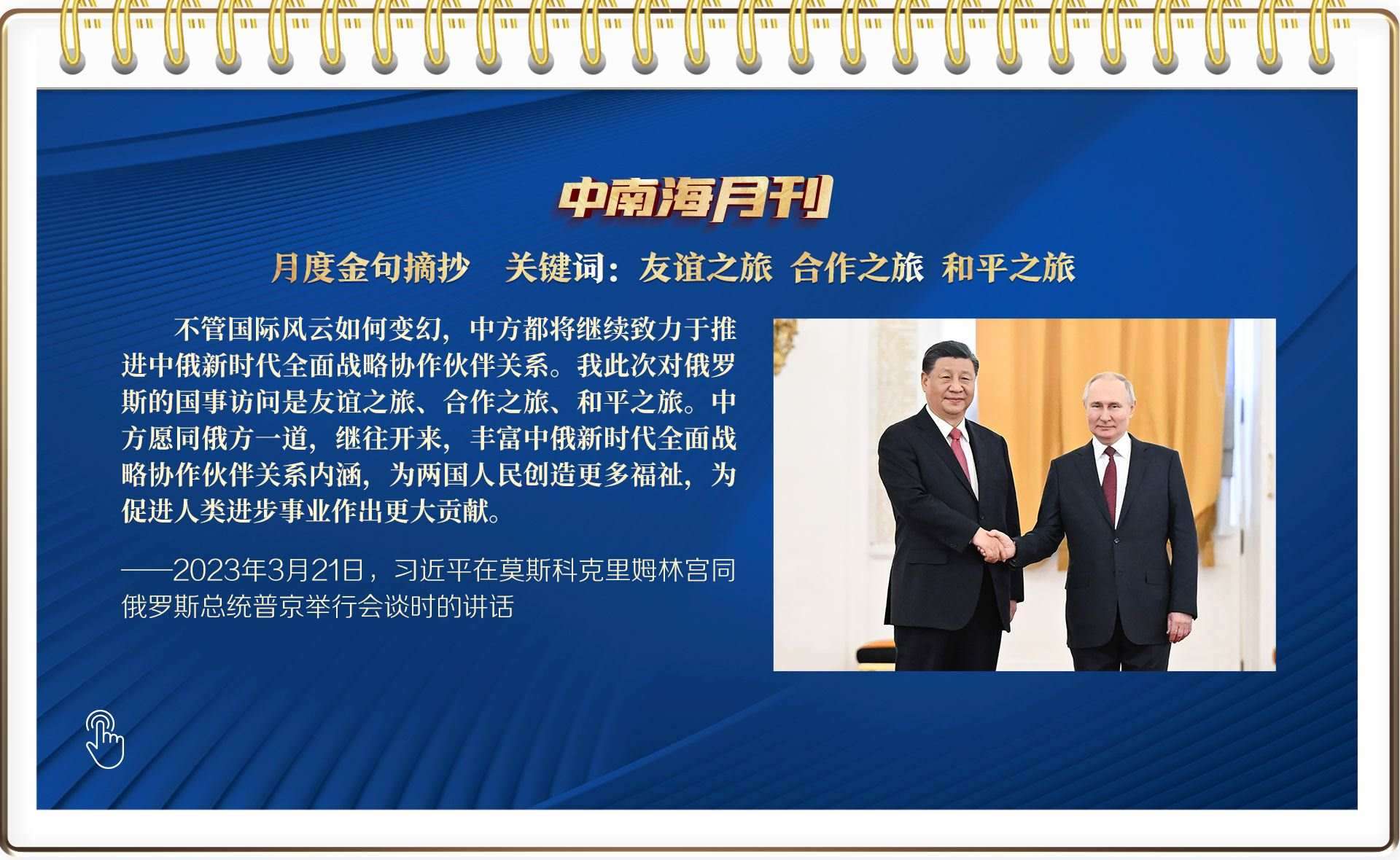 央視網(wǎng)《中南海月刊》運(yùn)用智能大數(shù)據(jù),與您一起回顧習(xí)近平總書(shū)記3月份繁忙的工作和講話,感受我們共和國(guó)前進(jìn)掌舵者、人民幸福領(lǐng)路人赤誠(chéng)的為民情懷和天下胸懷。