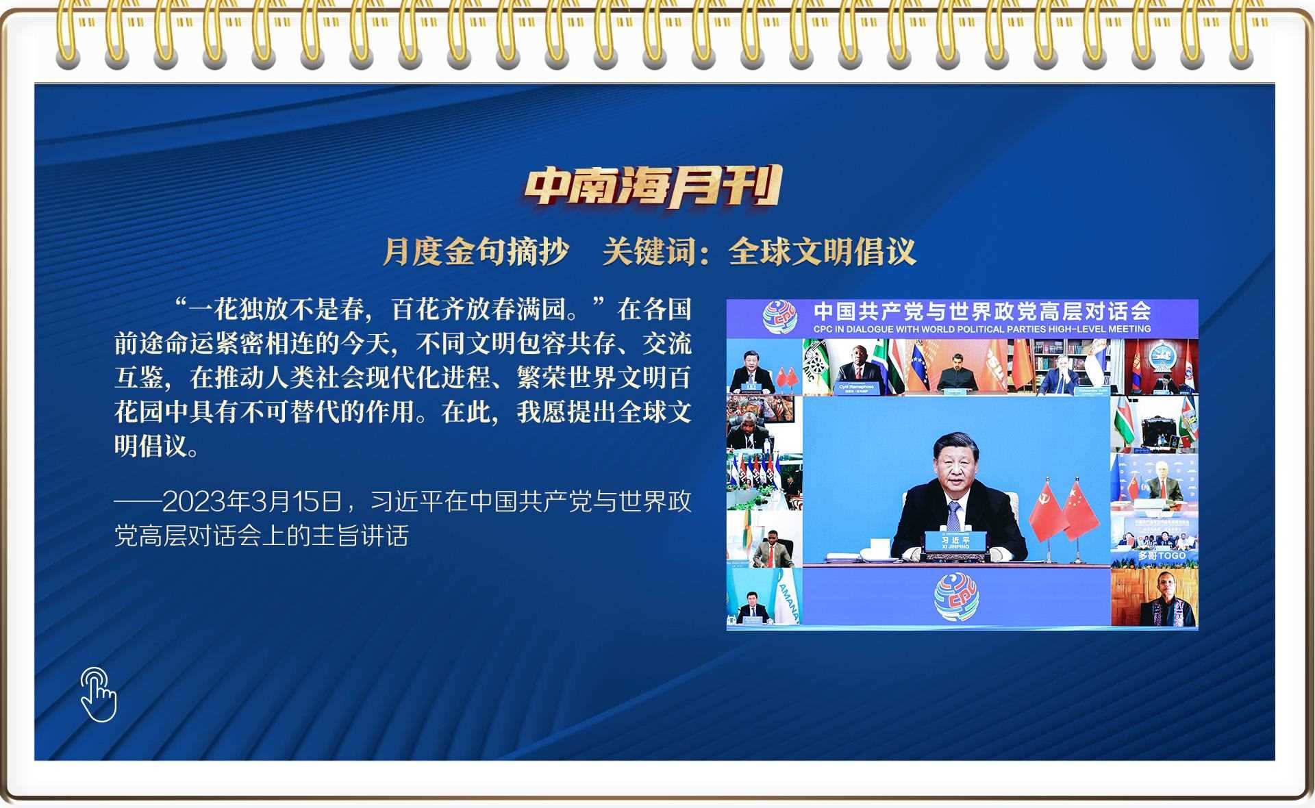 帶著對(duì)人類文明過(guò)去、現(xiàn)在和未來(lái)的深邃思考,習(xí)近平總書(shū)記在本月舉辦的全球性政黨盛會(huì)上,以四個(gè)“共同倡導(dǎo)”為實(shí)現(xiàn)路徑,鄭重提出全球文明倡議。繼全球發(fā)展倡議、全球安全倡議之后,這一中國(guó)智慧再次引發(fā)全球共鳴。