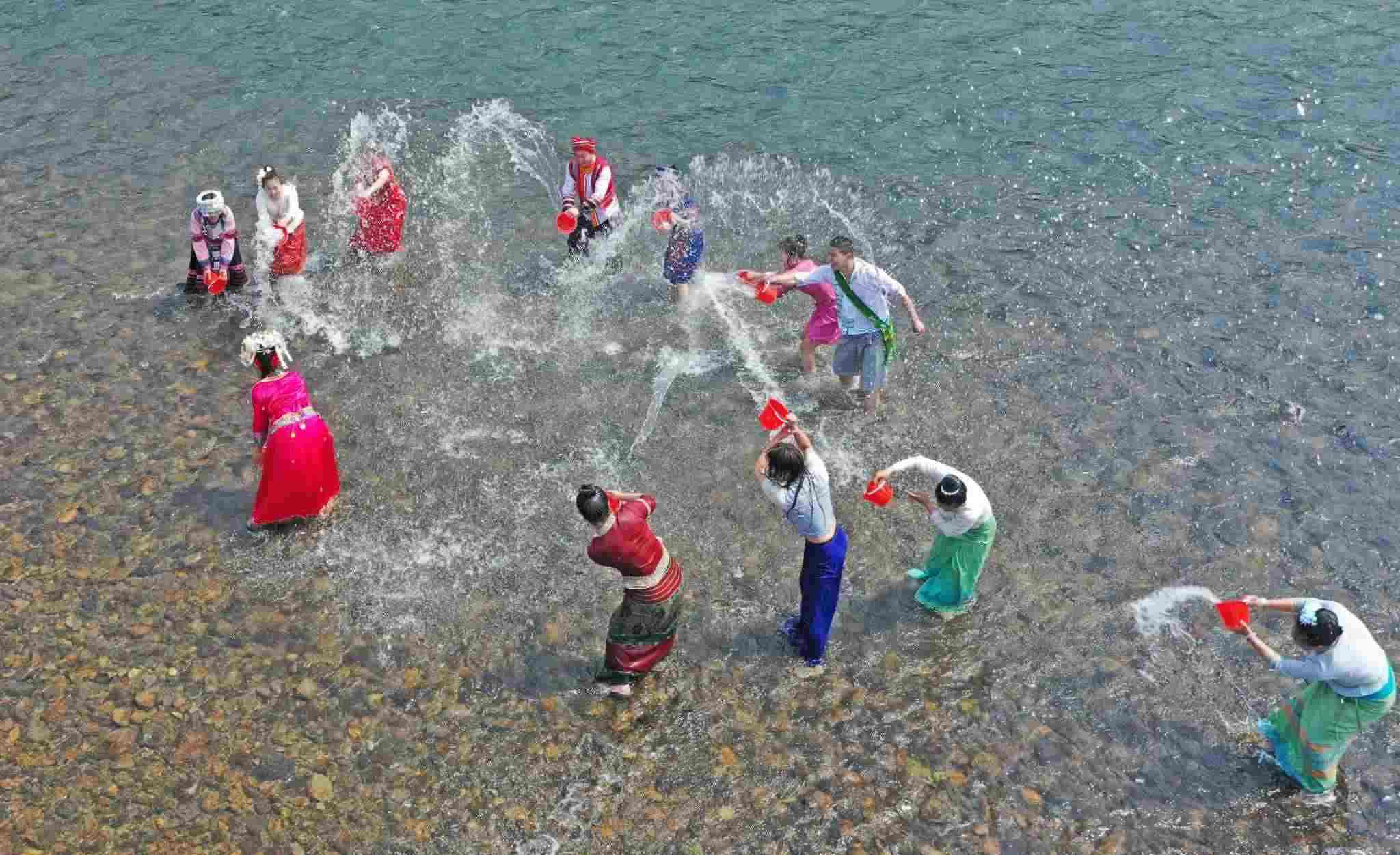 2023年4月12日,浙江臺(tái)州,仙居縣永安溪畔,傣族同胞正在參加潑水狂歡活動(dòng)。視覺中國