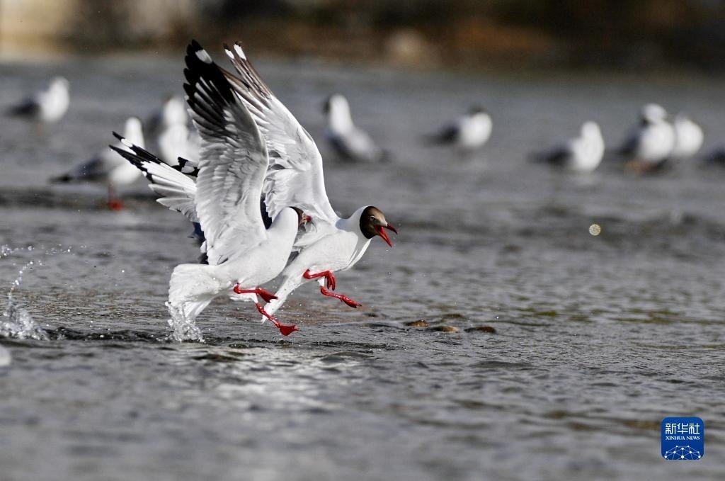 棕頭鷗在拉薩河上嬉戲(4月16日攝)。   新華社記者 張汝鋒 攝