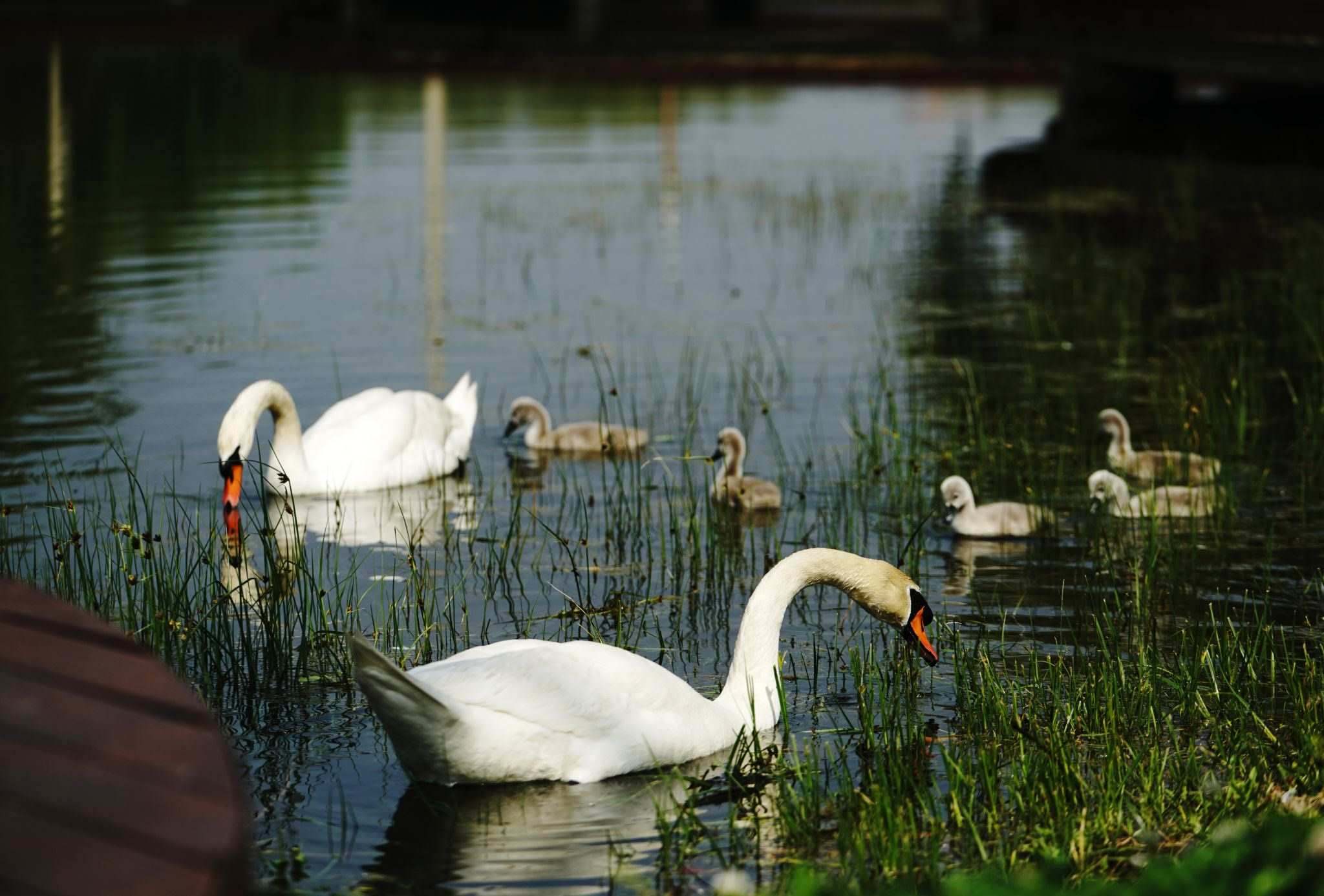 2023年4月26日,鄭州北龍湖濕地公園,天鵝“父母”帶領(lǐng)7只天鵝寶寶在湖中覓食嬉水。視覺中國