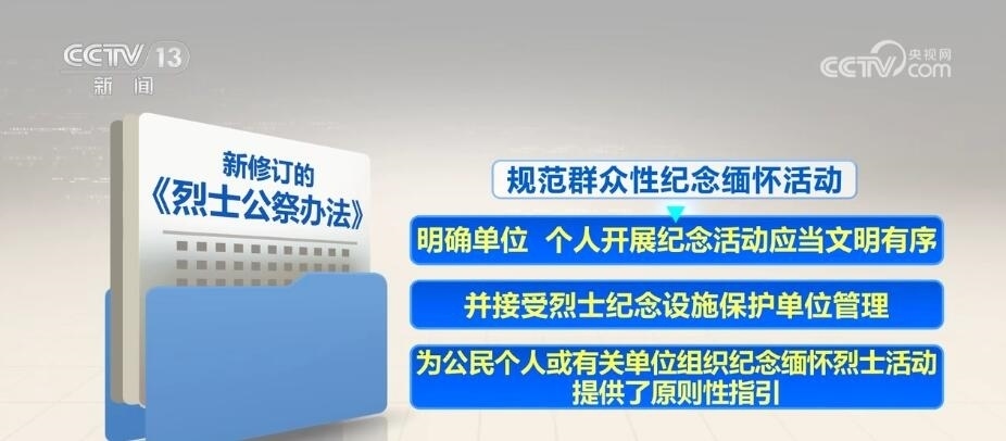 新修訂的《烈士公祭辦法》自5月1日起施行。其中,強(qiáng)調(diào)發(fā)揮公祭活動(dòng)對(duì)青少年的教育作用,要求各級(jí)各類學(xué)校組織學(xué)生以適當(dāng)方式參加烈士公祭,加強(qiáng)愛(ài)國(guó)主義、集體主義、社會(huì)主義教育。規(guī)范群眾性紀(jì)念緬懷活動(dòng),明確單位、個(gè)人開展紀(jì)念活動(dòng)應(yīng)當(dāng)文明有序,并接受烈士紀(jì)念設(shè)施保護(hù)單位管理,為公民個(gè)人或有關(guān)單位組織紀(jì)念緬懷烈士活動(dòng)提供了原則性指引。