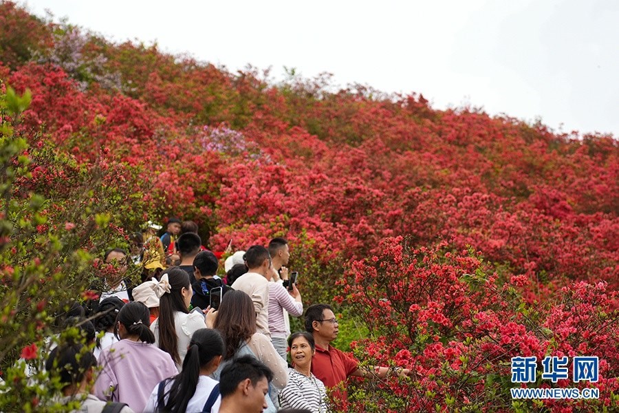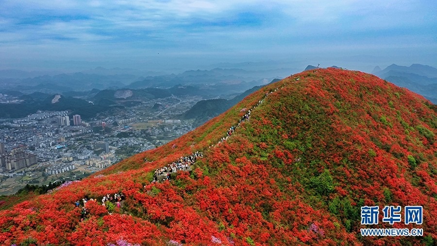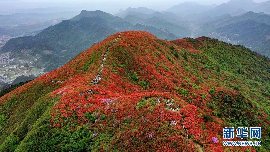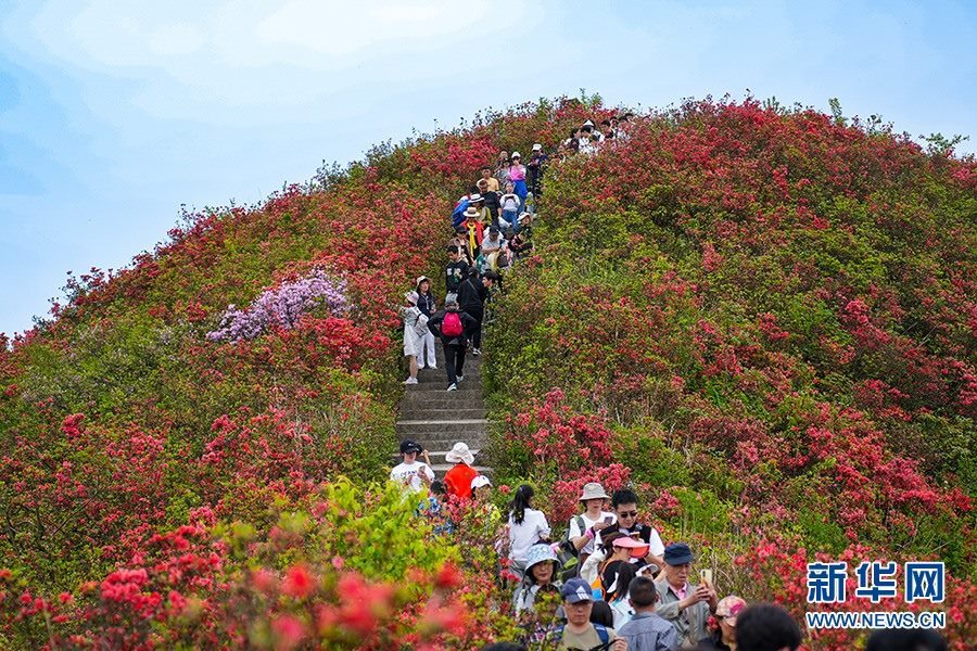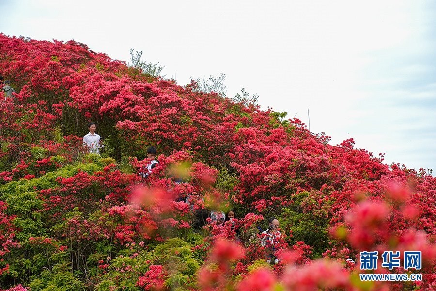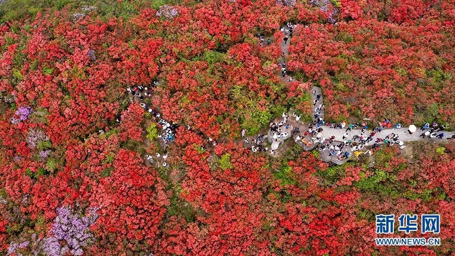 當(dāng)日,在貴州省黔東南苗族侗族自治州丹寨縣縣城邊海拔1400多米的龍泉山,萬畝杜鵑花競相綻放,山谷間、棧道旁、懸崖上,一顆顆、一簇簇、一朵朵杜鵑花迎風(fēng)搖曳,形成浩瀚花海,引來眾多游客登高望遠(yuǎn),飽覽靈山秀水之美。   新華網(wǎng)發(fā)(龍建睿 攝)