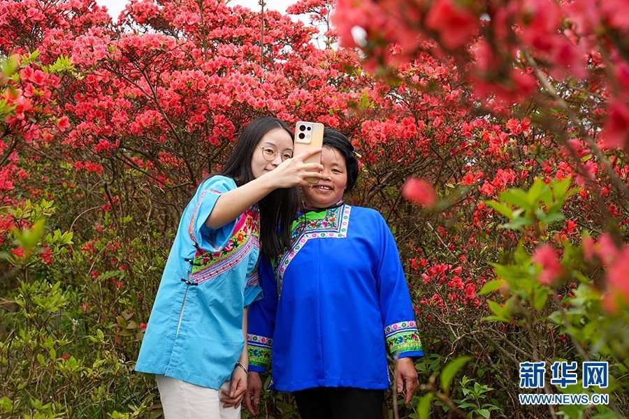 4月30日,身著少數(shù)民族服飾的游客在龍泉山上杜鵑花前拍照留念。新華網(wǎng)發(fā)(龍建睿 攝)