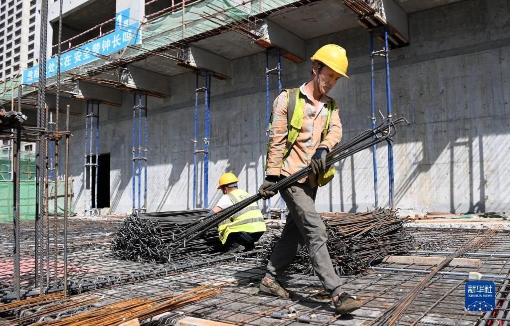 5月1日,在浙江省杭州市臨平區(qū)一個(gè)項(xiàng)目工地,中建三局的建設(shè)者在施工中。