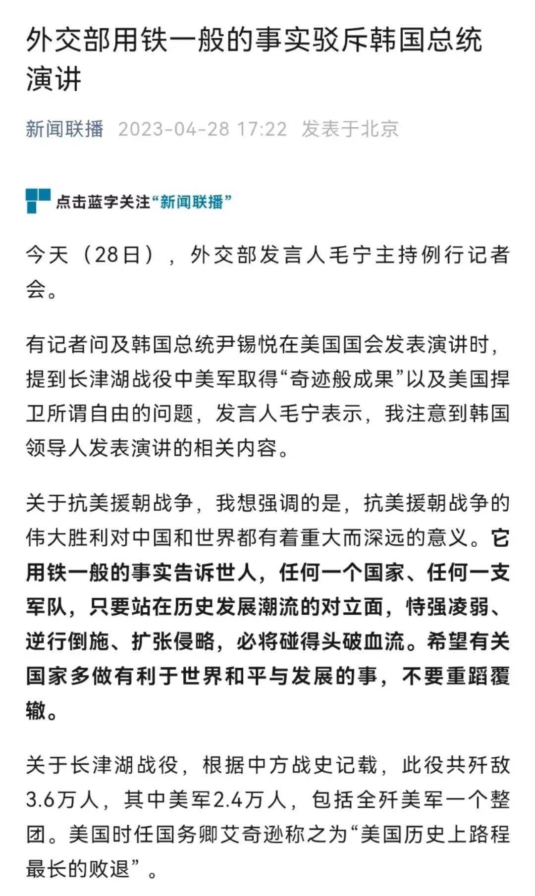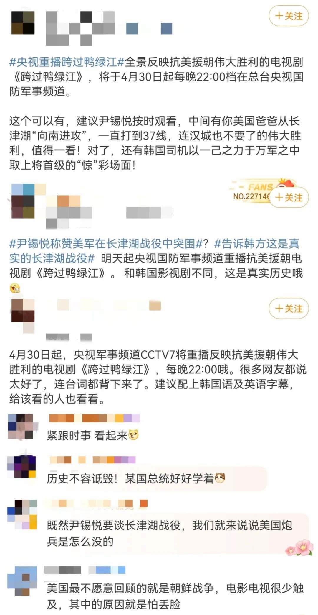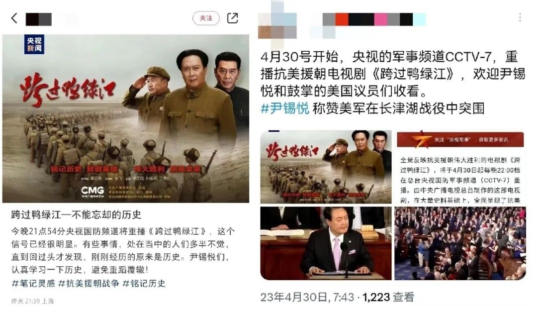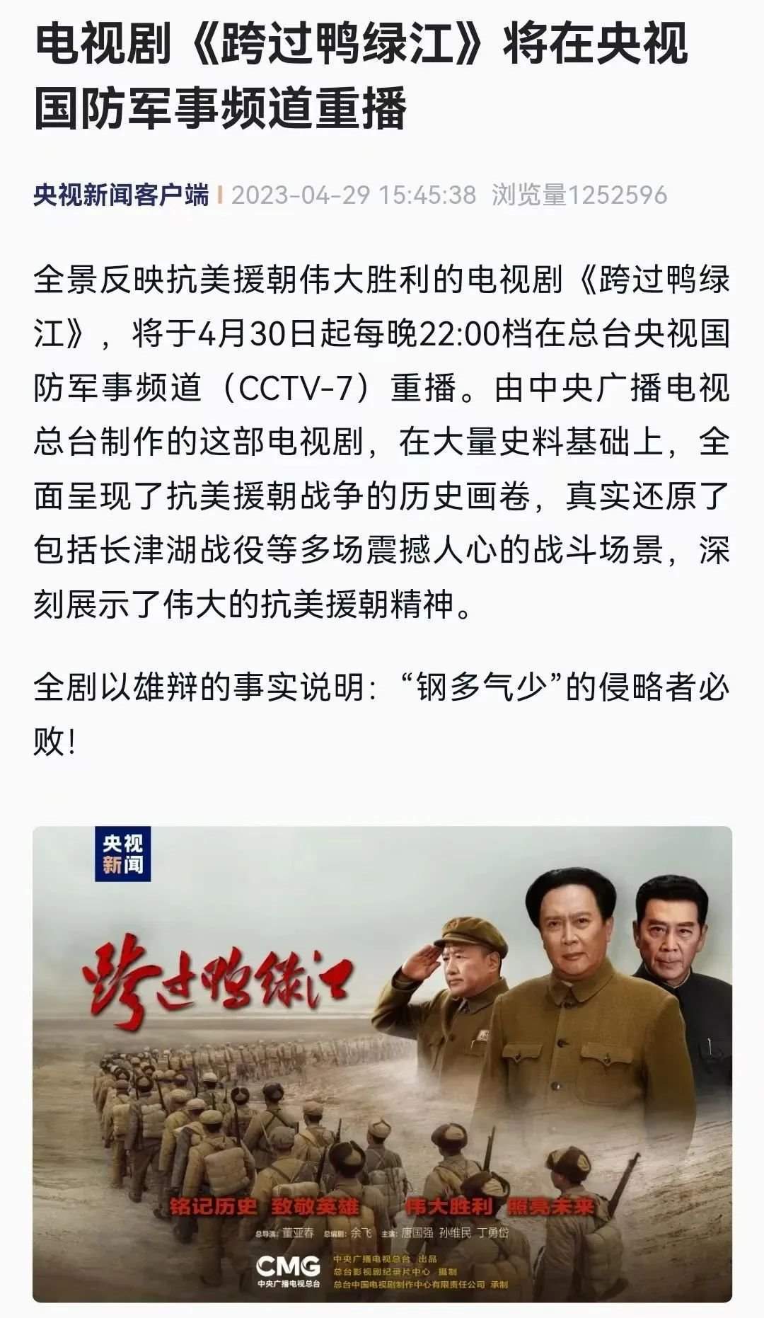 新加坡《聯(lián)合早報》更在4月30日晚10點準(zhǔn)時發(fā)布文章《電視劇<跨過鴨綠江>將在中國央視重播》,開篇明確重點:在韓國總統(tǒng)稱贊美國海軍陸戰(zhàn)隊第一師在長津湖戰(zhàn)役中的表現(xiàn)后,中國央視稱將從星期天(4月30日)起重播電視劇《跨過鴨綠江》。