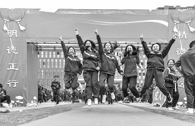 4月16日,安徽省安慶市田家炳中學高三學生在操場上游戲釋放壓力。江勝攝/光明圖片