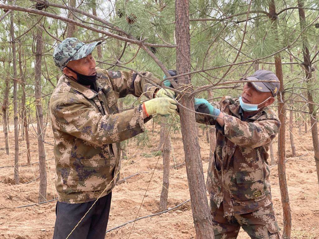 面龐黝黑的丁河勇在白芨灘工作了31年,治沙的情懷像樹苗一樣扎根在這片土地。“呵護(hù)這些樹苗就像呵護(hù)我的孩子一樣,修剪、澆灌、補(bǔ)植、病蟲害防治,絲毫馬虎不得。我已經(jīng)習(xí)慣了與樹為伴的生活,隔兩天不上山看看林子,心里就不踏實(shí)?!彼f。