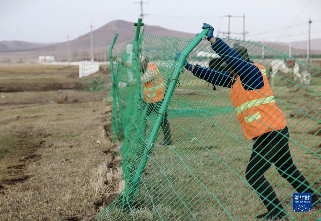 5月2日,河北省承德市豐寧滿族自治縣大灘鎮(zhèn)扎拉營(yíng)村的護(hù)林員趙世海(右)和羅金寶在海留圖國(guó)家濕地公園修復(fù)護(hù)欄。   新華社記者 邢廣利 攝
