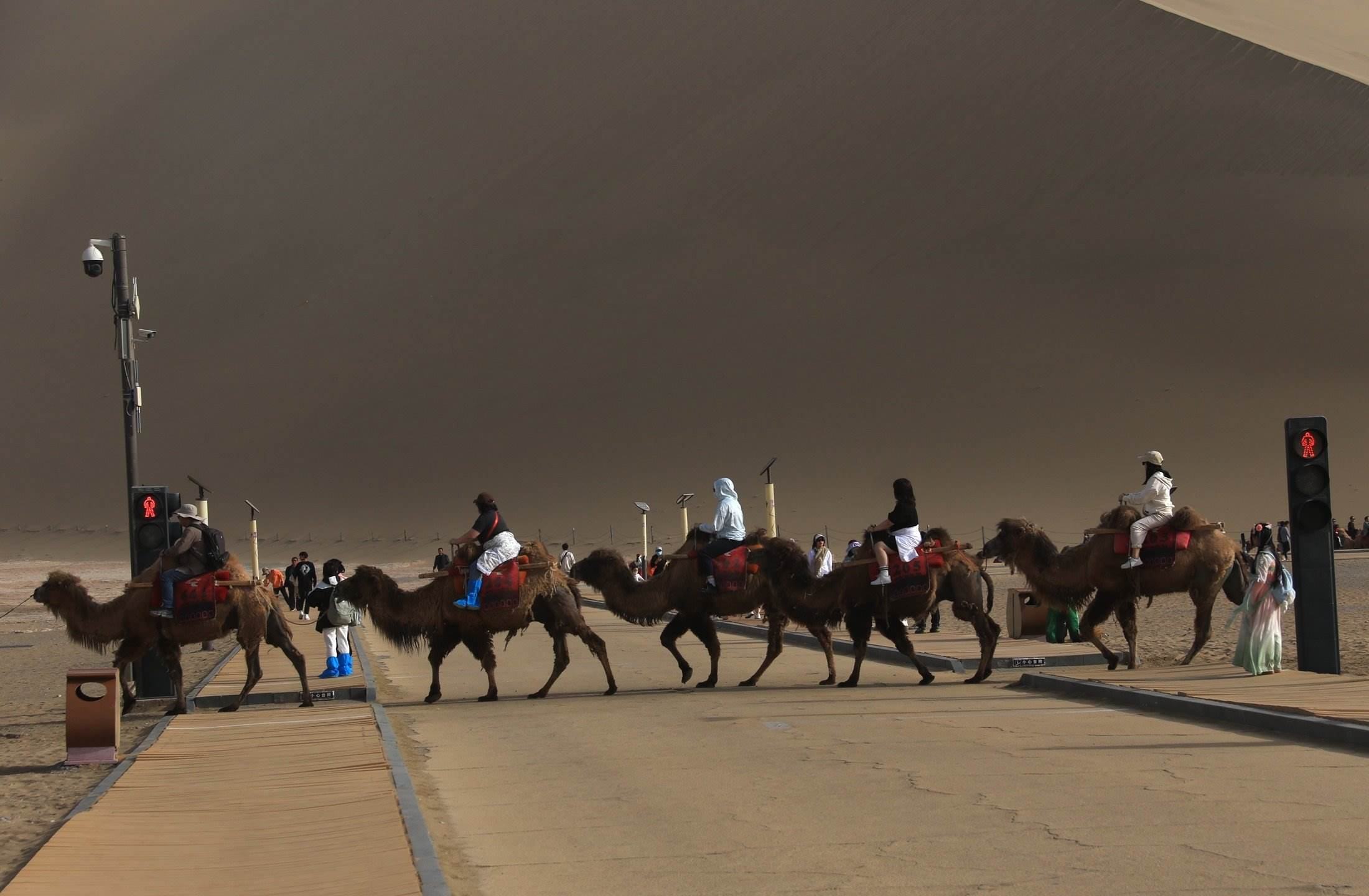 “五一”假期,甘肅省敦煌市鳴沙山月牙泉景區(qū)迎來旅游高峰。設(shè)置在該景區(qū)內(nèi)行人步道和駱駝通道兩個交叉點的“駱駝紅綠燈”,引導(dǎo)人、車和駱駝有序分流,不僅確保了景區(qū)交通安全暢通,也成為景區(qū)內(nèi)的“網(wǎng)紅打卡點”之一 。