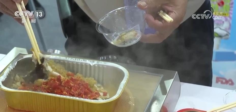 最受歡迎的莫過于預制菜的展位,熱辣的川菜、清淡的粵菜、精致的中式點心,還有各地的特色小吃,各種菜品應有盡有。一加熱,香氣四溢,引來不少外國客商試吃。