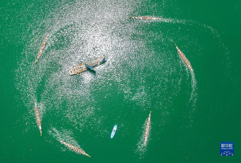 5月1日,湖北省宜昌市秭歸縣歸州鎮(zhèn)萬古寺村村民與游客共同劃龍舟(無人機(jī)照片)。
