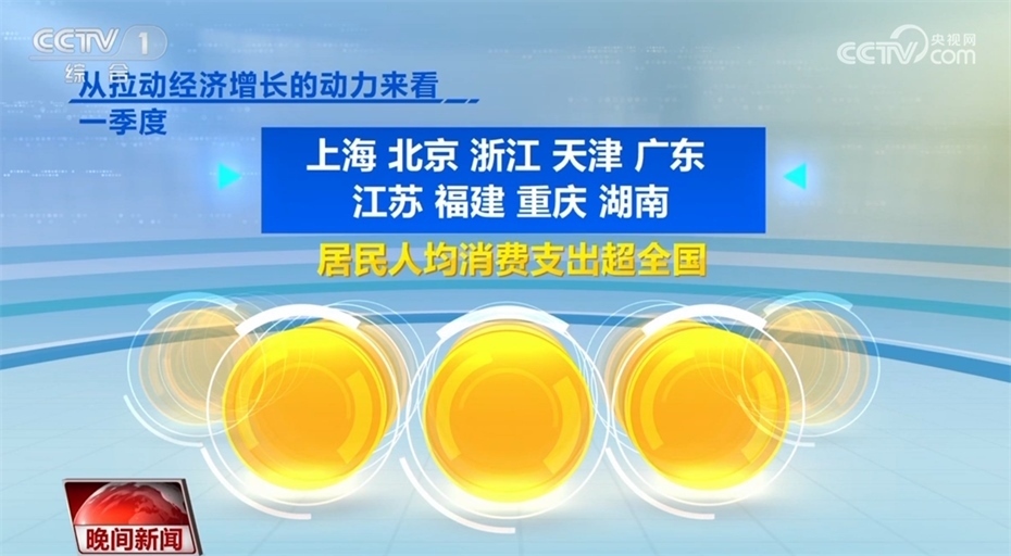 此外,各地經(jīng)濟(jì)發(fā)展也呈現(xiàn)回升向好態(tài)勢。目前,全國31個?。▍^(qū)、市),已經(jīng)全部公布一季度的經(jīng)濟(jì)運(yùn)行數(shù)據(jù)。從GDP增速來看,31個?。▍^(qū)、市)中有23個省份跑贏全國一季度GDP平均增速4.5%,從地區(qū)GDP總量看,有12個省份超1萬億,廣東超過了3萬億。從拉動經(jīng)濟(jì)增長的動力來看,一季度,上海、北京、浙江、天津、廣東、江蘇、福建、重慶、湖南9省份,居民人均消費(fèi)支出超全國。
