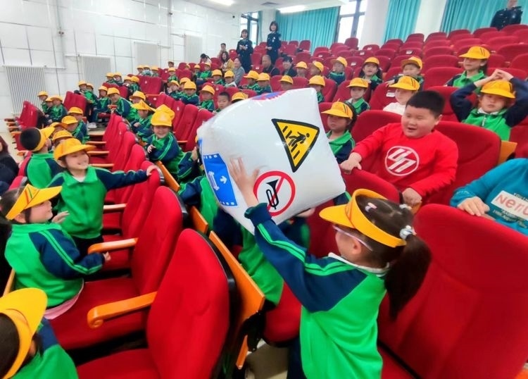 學(xué)警教同學(xué)識別交通道路標(biāo)志牌。