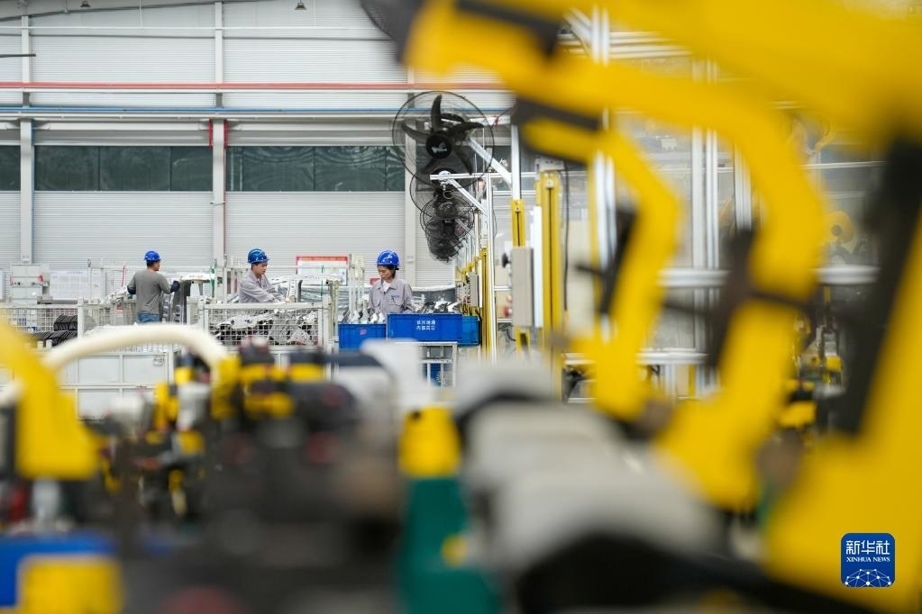 5月4日,在浙江省湖州市長興經(jīng)濟(jì)技術(shù)開發(fā)區(qū)一家汽車部件有限公司,工人生產(chǎn)新能源汽車T型梁。