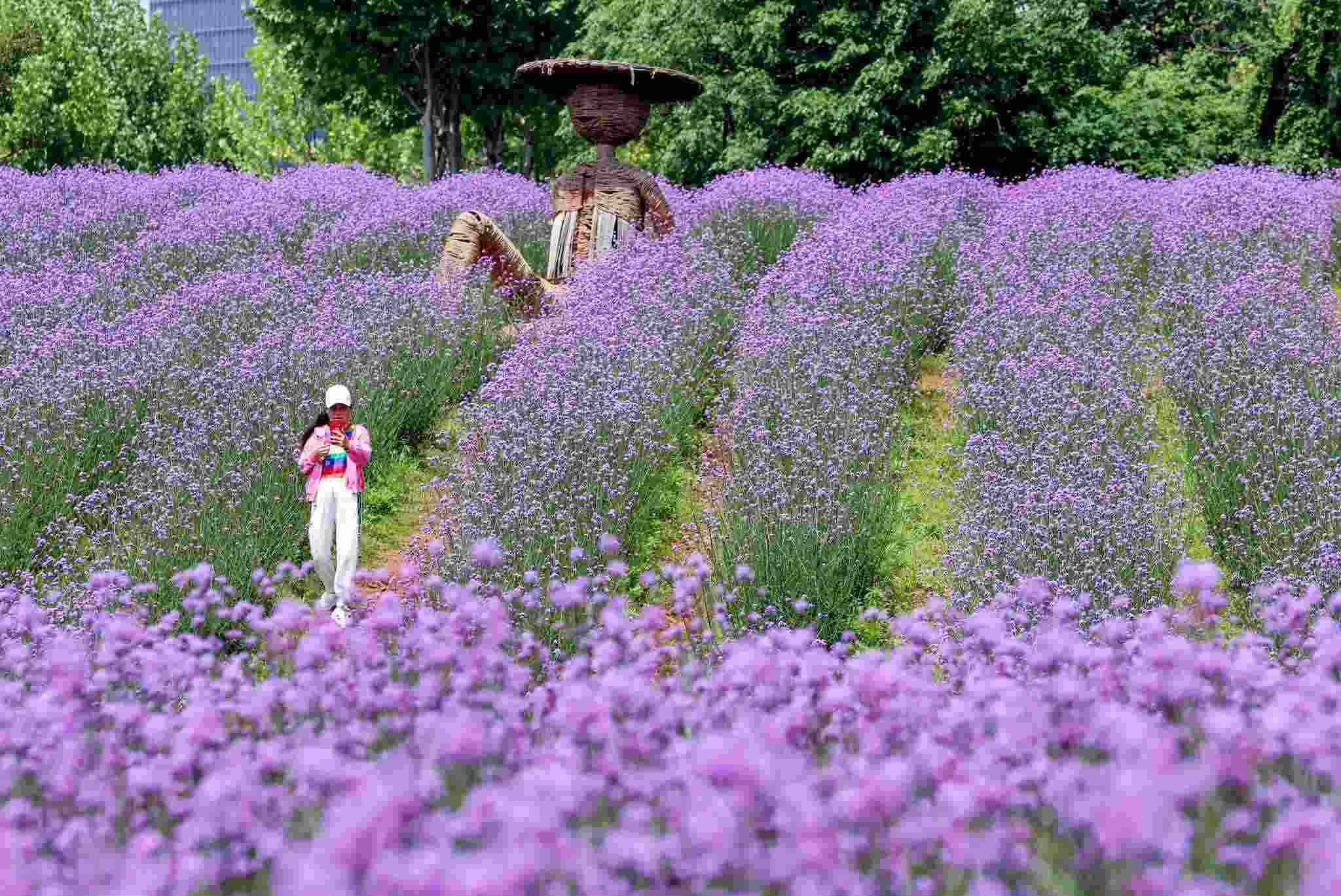 武漢:馬鞭草盛放 游人花海間拍照