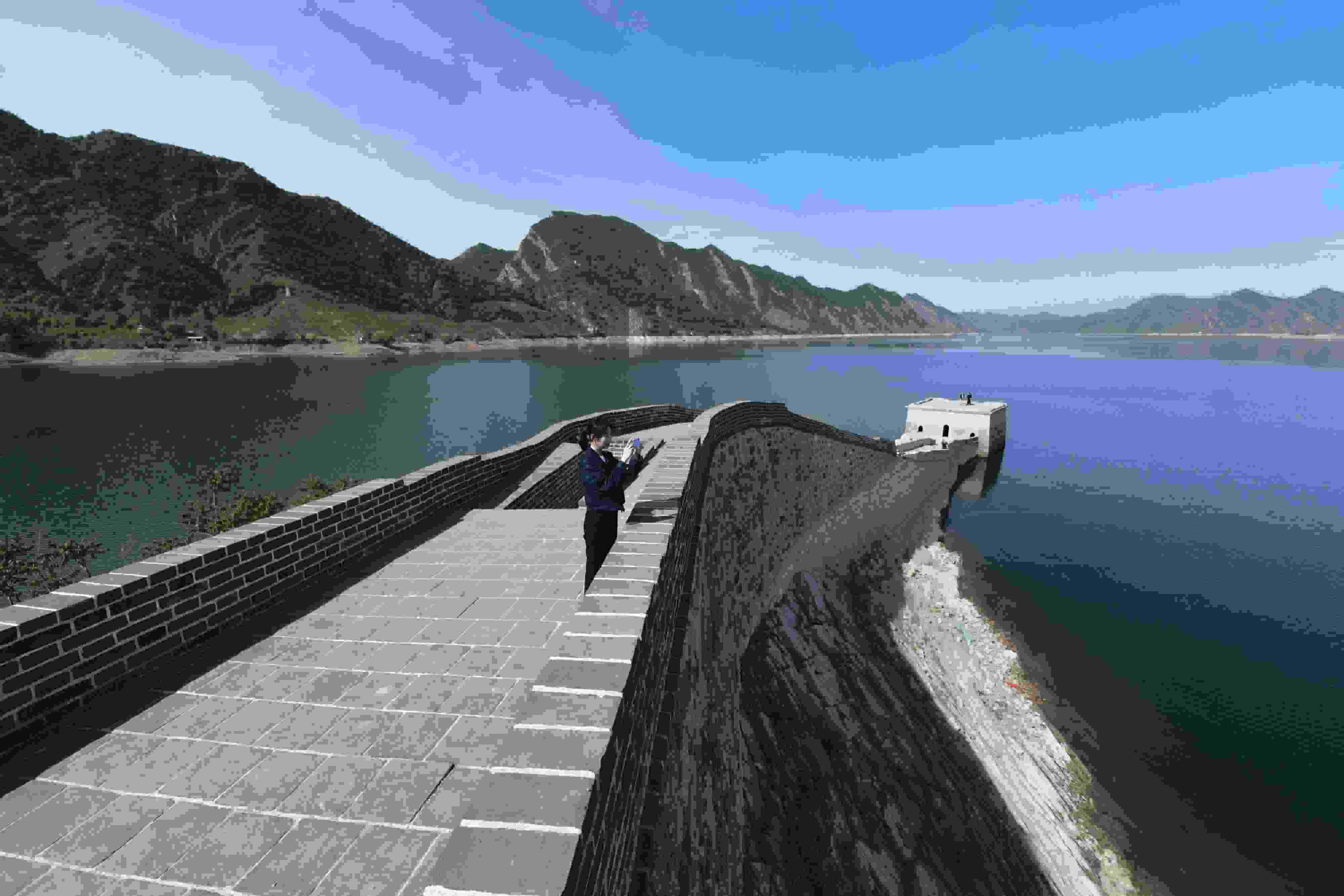2023年5月8日,河北承德,寬城滿族自治縣境內(nèi)潘家口水庫的“水下長城”。這段“水下長城”是明長城的遺址,20世紀(jì)70年代因建設(shè)水利樞紐工程,部分長城隱沒水下,從而形成“水下長城”景觀。 視覺中國