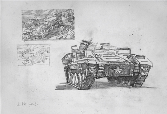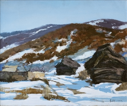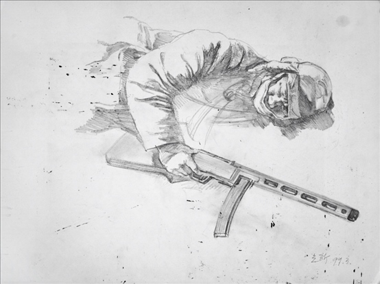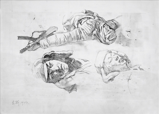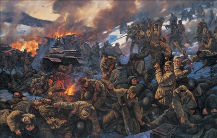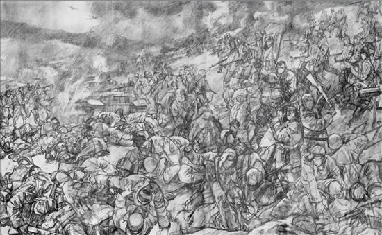 《激戰(zhàn)松骨峰》描繪的是抗美援朝戰(zhàn)爭中,中國人民志愿軍與美軍激烈廝殺的悲壯場面。作者從動態(tài)型的構圖與形象表層,把戰(zhàn)爭集團之間的搏殺以濃重的筆調(diào)展現(xiàn)開來,表現(xiàn)了中國人民志愿軍英勇頑強、熱愛自由和勇于犧牲的精神,展示了歷史的悲劇性沖突。作者從沉甸甸的歷史中找到戰(zhàn)爭中最慘烈、最殘酷、最能表現(xiàn)人物悲劇性命運的瞬間,用現(xiàn)實主義的創(chuàng)作手法,扎實、生動地塑造了一個又一個志愿軍勇士的形象。硝煙籠罩著戰(zhàn)場,鮮血與白雪融合成冰,敵我雙方,犬牙交錯,生死搏殺。同時,也使我們感受到戰(zhàn)爭的殘酷與生命的脆弱。作者處理宏大的戰(zhàn)爭場面獨具匠心:陽光透過硝煙,有節(jié)奏地營造出戰(zhàn)場的空間;雪地上被間隔的藍色陰影,反襯出黃褐色的主調(diào)。作品對細部進行了恰如其分的刻畫,但又不失對整體宏觀的把握,厚重的色彩中透出熱情,樸拙的筆觸映著畫家的激動。