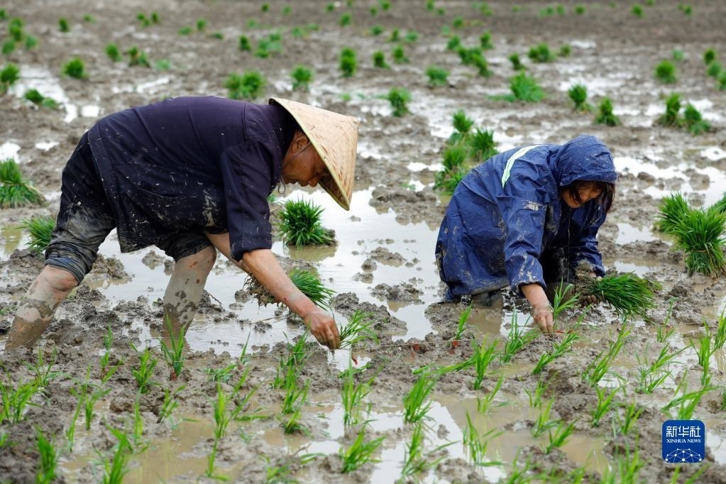 5月9日,在四川省崇州市道明鎮(zhèn)協(xié)和社區(qū),農(nóng)民在一片高標(biāo)準(zhǔn)農(nóng)田里種植水稻。