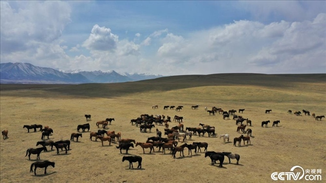 甘肅張掖,初夏時(shí)節(jié),位于祁連山下的山丹馬場(chǎng)積雪消融,草原開始泛綠,成群的馬匹正在吃草,一派生機(jī)勃勃的景象。