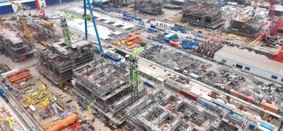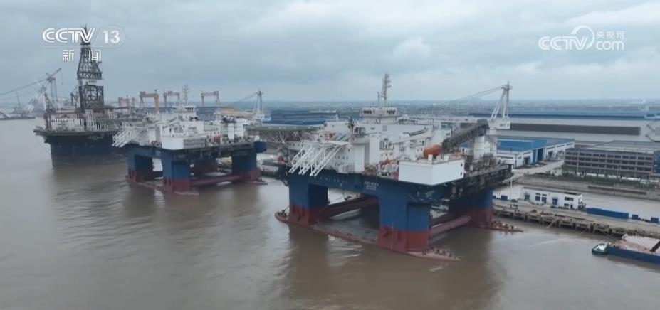 這些大家伙,都是世界技術(shù)比較領(lǐng)先的一些海工裝備。通過航拍的鏡頭,給大家展現(xiàn)一下,最遠的是圓筒形超深水鉆探平臺。因為它的外形是獨特的圓筒型設(shè)計,所以它的抗風浪性、作業(yè)水深的能力非常得好,技術(shù)指標創(chuàng)下多項世界第一。這家企業(yè),一共向國外交付了6艘同類型的產(chǎn)品。