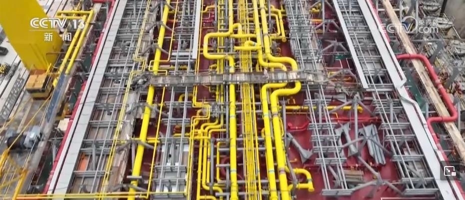 這艘船除了大,技術(shù)也十分先進。這上面有一些密密麻麻的管道,是用來處理加工從海底開采出來的原油,再進行提煉、分離。其實,我們可以通俗理解它就是一個海上可以移動的化工廠。