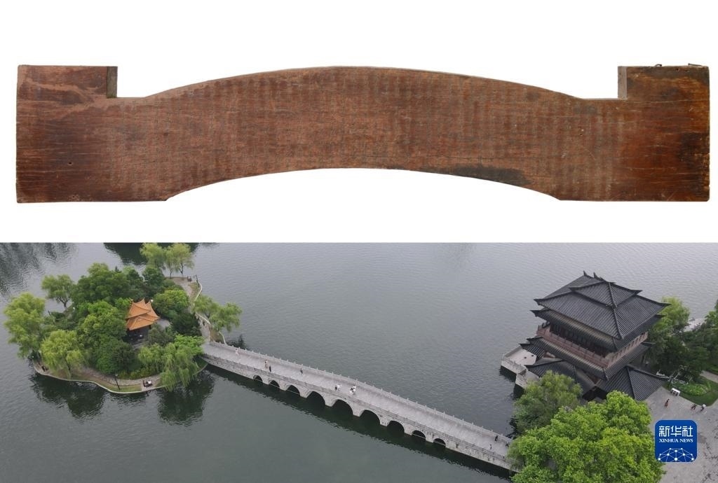 這是一張拼版照片,上圖為:《逍遙津木刻枋》,現收藏于安徽博物院(新華社發(fā),吳艷攝);下圖為:5月17日拍攝的位于安徽省合肥市的逍遙津公園(無人機照片,新華社記者張端攝)。