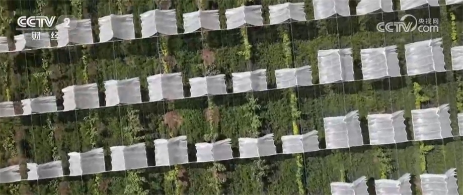總臺央視記者 金荷淼:這里是陜西楊凌的一處獼猴桃產(chǎn)業(yè)園,我所在的位置是一個黃肉獼猴桃的標準化種植基地,可以看到現(xiàn)場是采用了一個壟上栽培的方式,保留了比較寬的行距,能夠有利于排水。而且我們發(fā)現(xiàn),每一支主干是分出來兩根藤蔓,在藤蔓之上做了一個這樣的水平棚架,水平棚架的好處就在于能夠保證每一個獼猴桃的果實都能夠接受同等程度的水分和光照,從而使果實的大小質(zhì)量均勻統(tǒng)一。