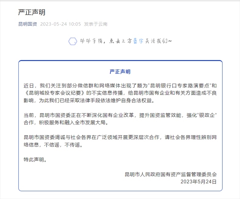 ·昆明市國(guó)資委發(fā)布聲明,“昆明銀行口專(zhuān)家路演要點(diǎn)”和《昆明城投專(zhuān)家會(huì)議紀(jì)要》不實(shí)。