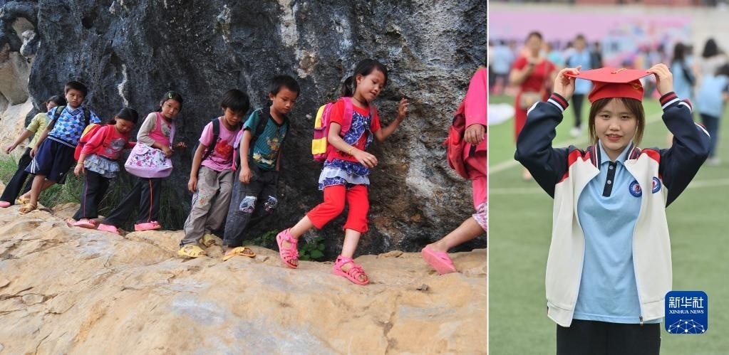 拼版照片:上圖為2023年5月20日,蒙俐谷在大化瑤族自治縣第二中學(xué)高二年級教室里學(xué)習(xí)(新華社記者胡星宇攝);下圖為2012年9月3日,在大化瑤族自治縣板升鄉(xiāng)弄雷村,7歲的蒙俐谷(右一)爬懸崖去學(xué)校讀書(新華社記者黃孝邦攝)。一年后將參加高考的蒙俐谷,希望能考上理想的大學(xué)。